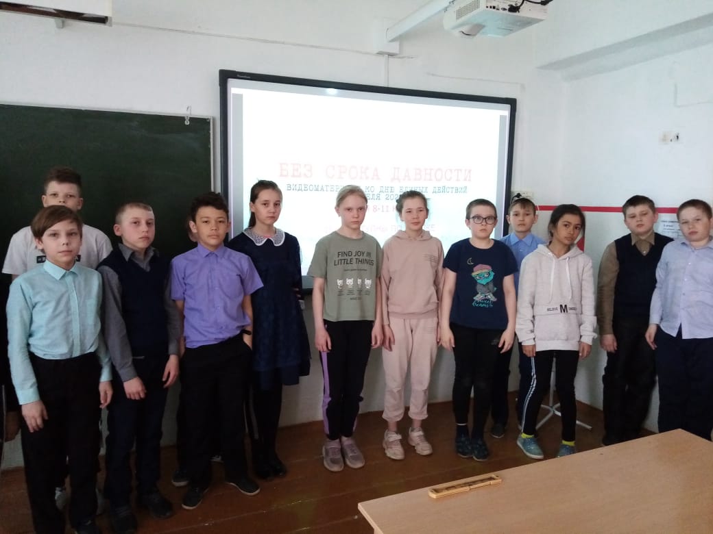 19 апреля в России - памятная дата. В этот день народ России отдаёт дань Памяти жертвам геноцида советского народа в Великой Отечественной Войне. Учащиеся школы совершили исторический экскурс в прошлое через фильм "Без срока давности", написали письма в будущее "Чтобы помнили", посетили выставку книг школьной библиотеки "Сильные духом".