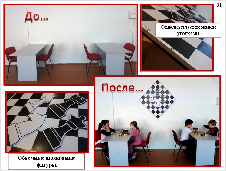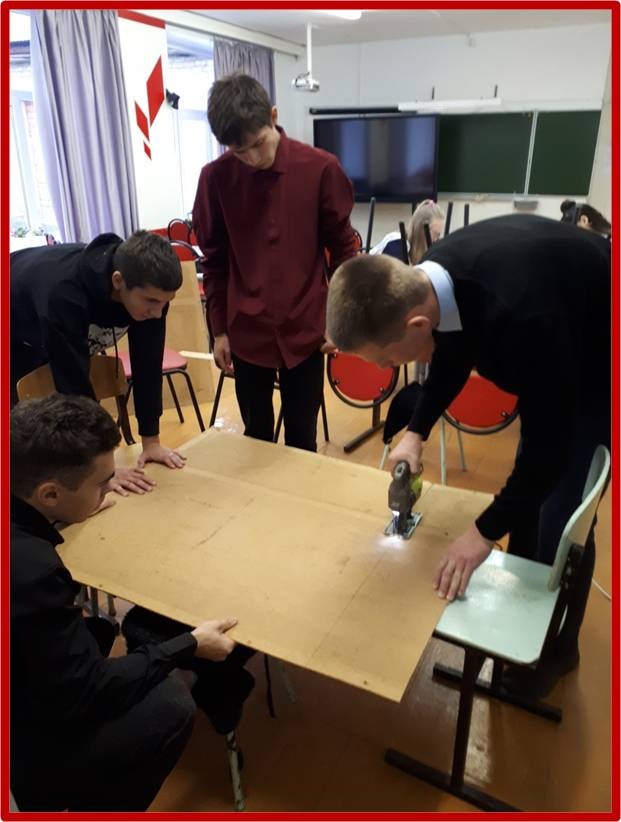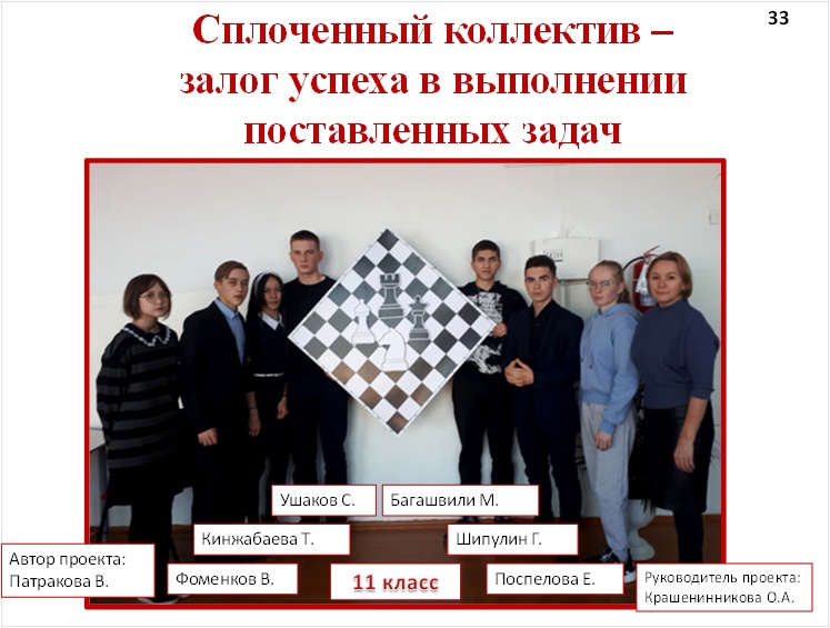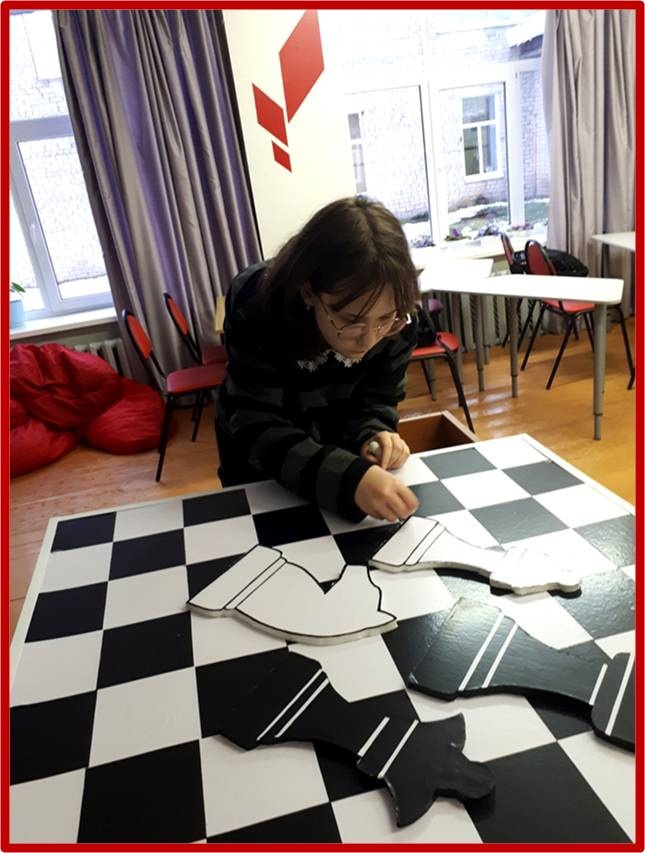 В проекте второго года была задействована в помощь команда 11 класса, так как нам были необходимы навыки использования электроинструментов. Для оформления стены в проектной аудитории мы создали шахматную доску с объемными шахматными фигурами. В дальнейшем мы хотим украсить панели в этом же шахматном стиле. Работа продолжается в рамках проекта, заинтересованных лиц становится больше. Ведь коллективный проект всегда приносит больше результатов, чем индивидуальный.