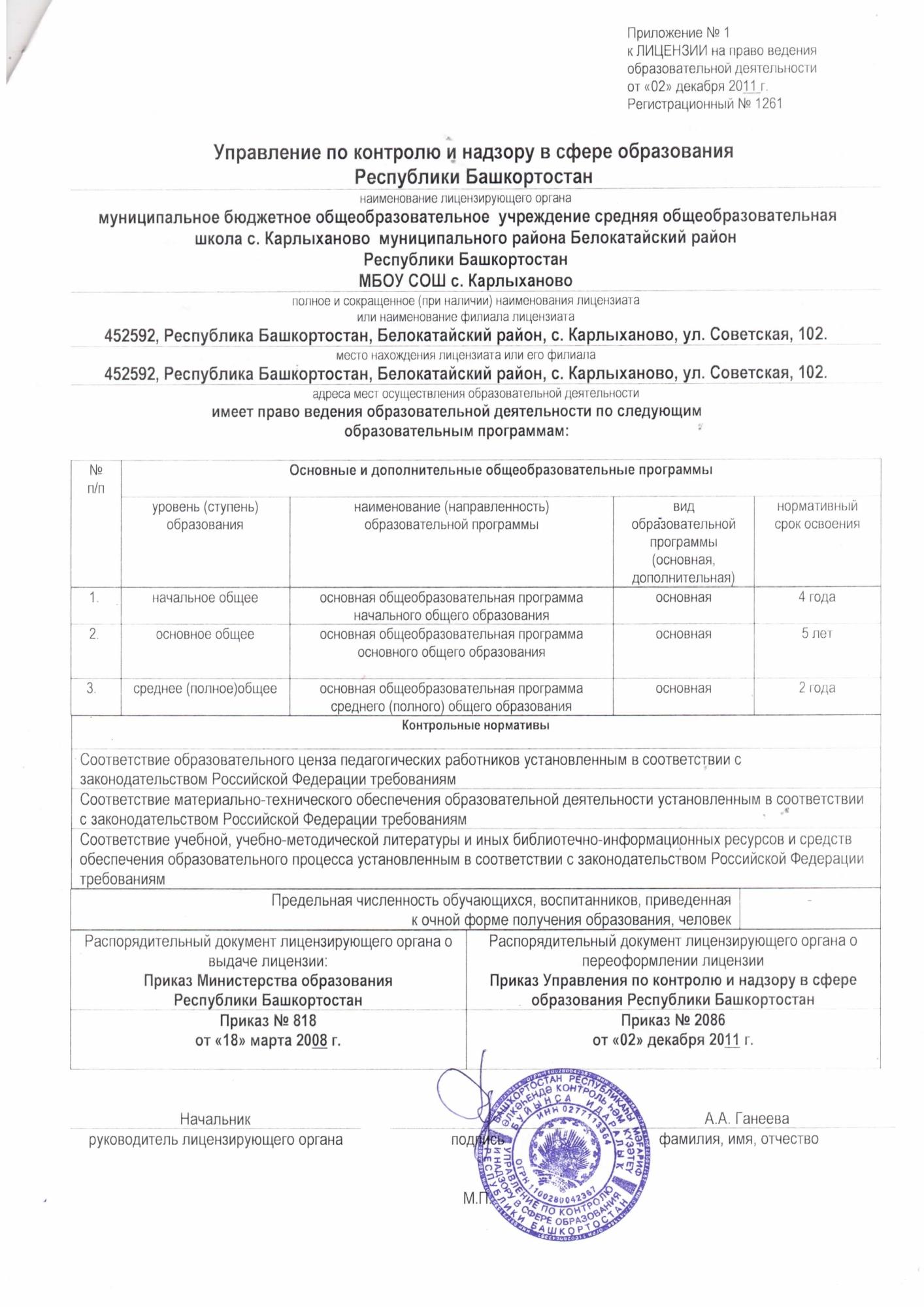 | Адрес места нахождения образовательной организации | 452592, Республика Башкортостан, Белокатайский район, с. Карлыханово, ул. Советская, 102 |